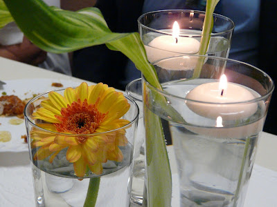 Also wir hatten auch hohe Gläser, allerdings mit Gebera. Immer in ner Dreiergruppe mit Schwimmkerzen. Dazu gabs noch langstielige Blätter aus dem Garten meiner Oma.